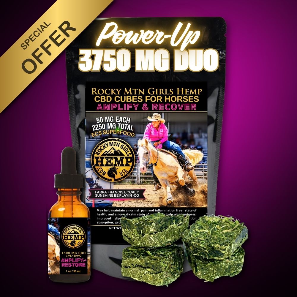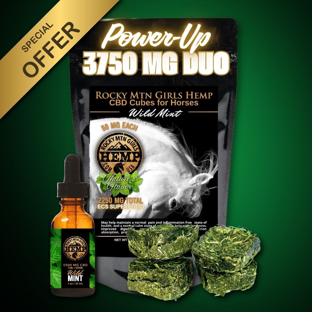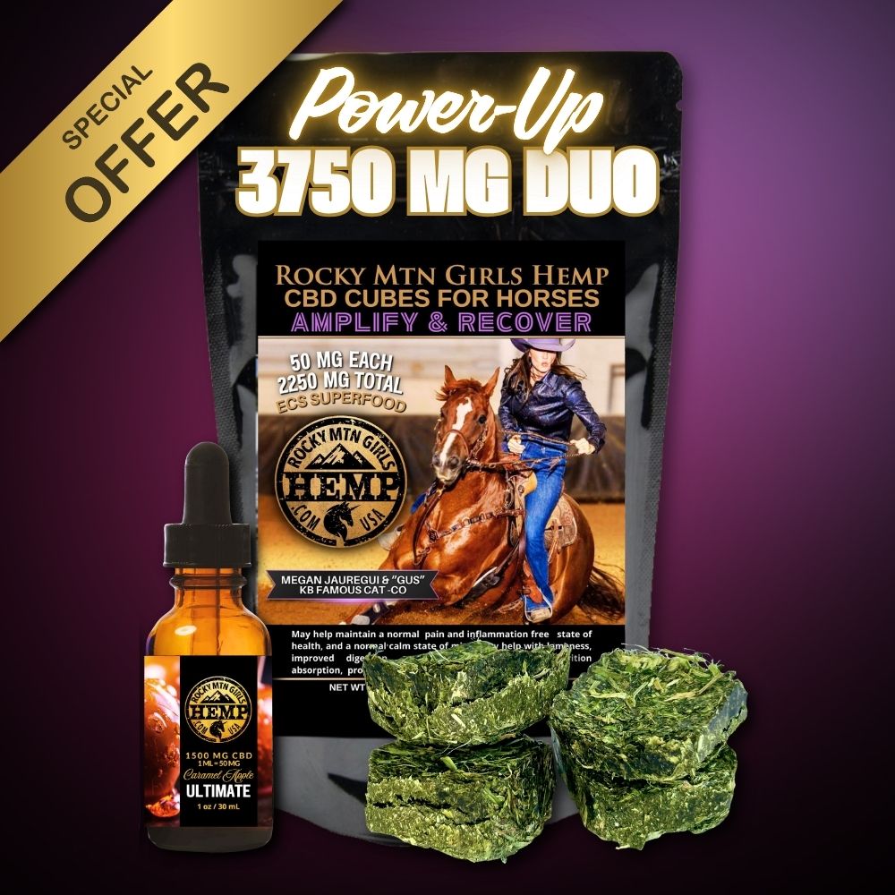 Strong, steady, and ready for anything — that’s the goal. This Duo combines CBD Cubes for horses — Wild Mint or Amplify & Recover (45 pc bag) with a fresh alfalfa taste — plus a full-spectrum tincture in Caramel Apple, Wild Mint, or Amplify & Restore (Natural), giving you flexible dosing for every ride, rest, or recovery day. Keep your horse balanced, happy, and performing their best, while enjoying 15% off the Duo.