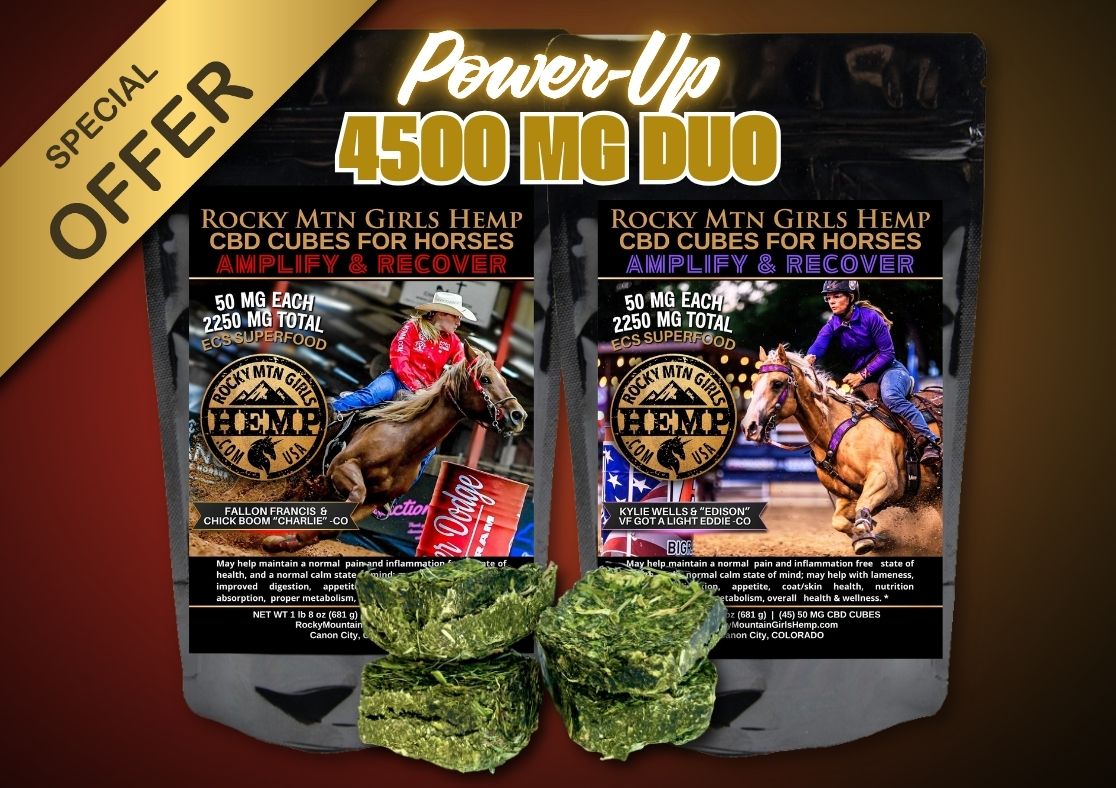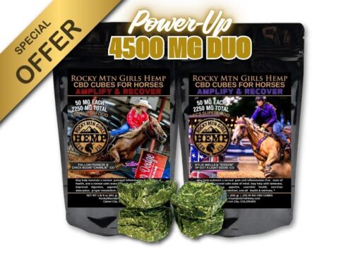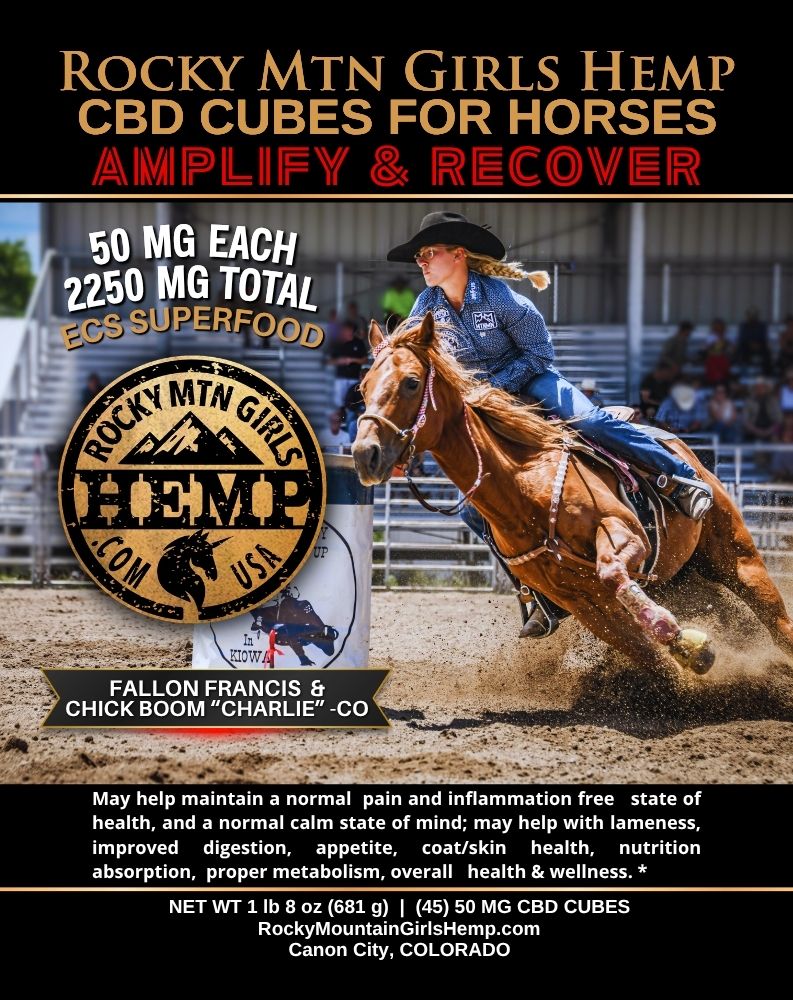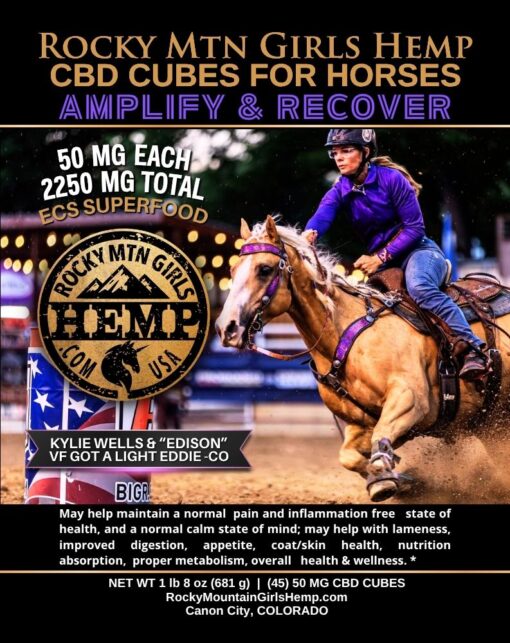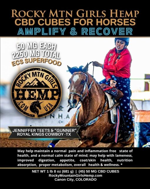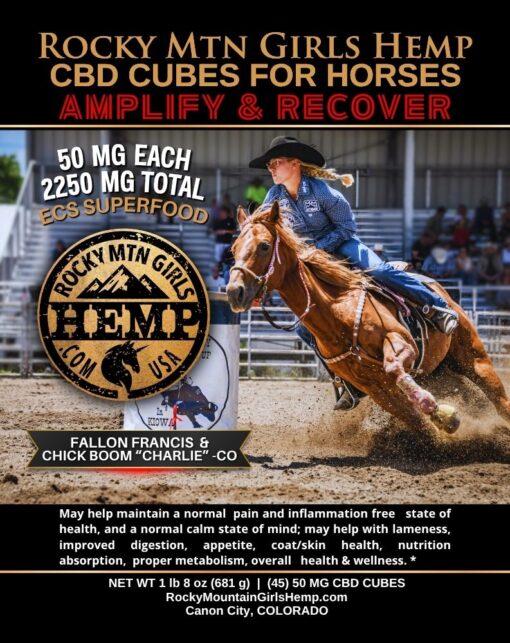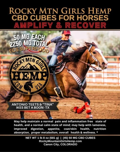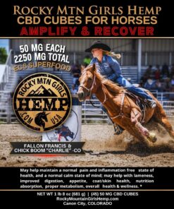 CBD alone is powerful, yet some experience an EXTRA benefit to the synergy of major and minor cannabinoids, terpenes and flavonoids (full spectrum including <0.3% THC) producing an ‘entourage effect’ vs. a single compound alone. The rich full spectrum of phytonutrients crafted in Rocky Mtn Girls CBD Cubes for Horses are designed to get winning results. Read more about “Hemp CBD for Performance & Their Riders”
