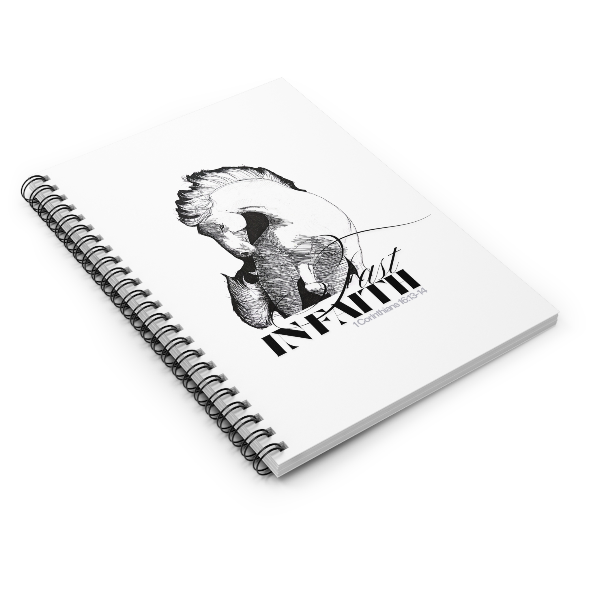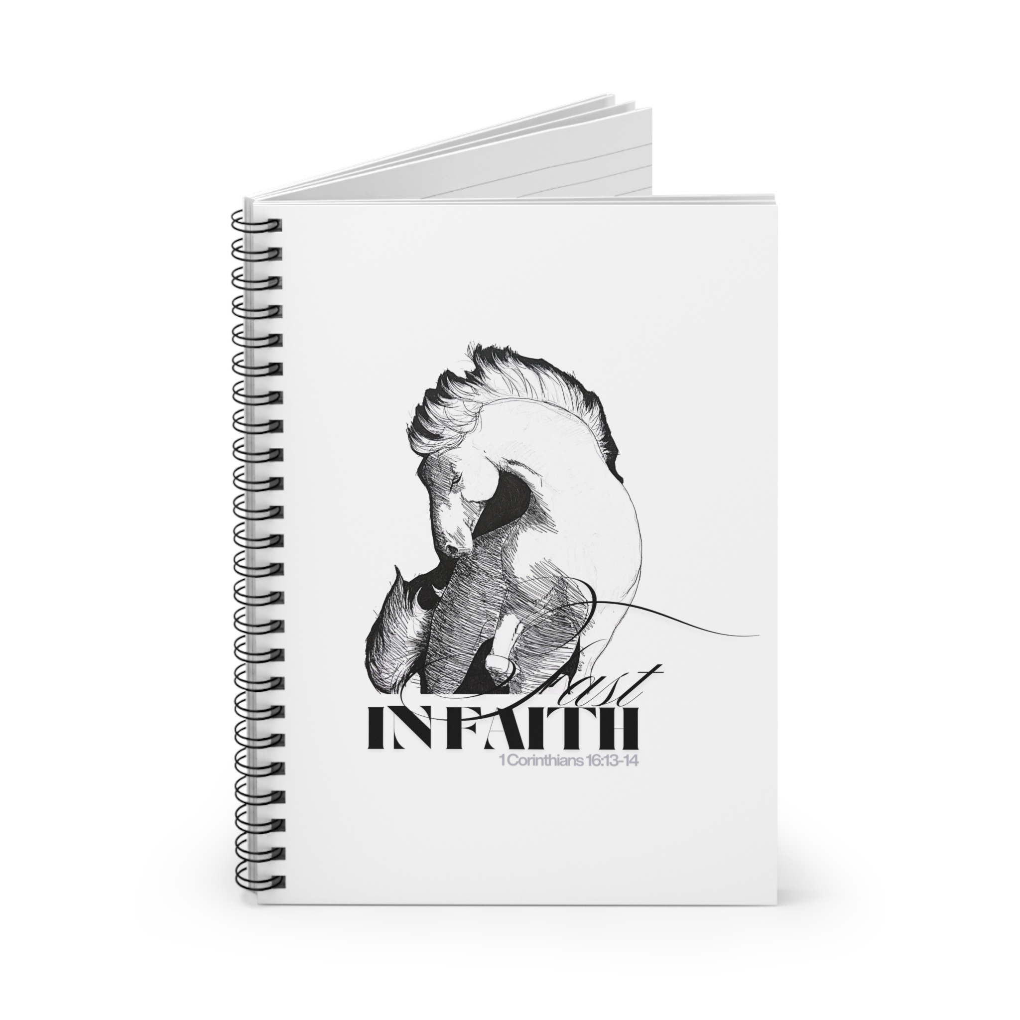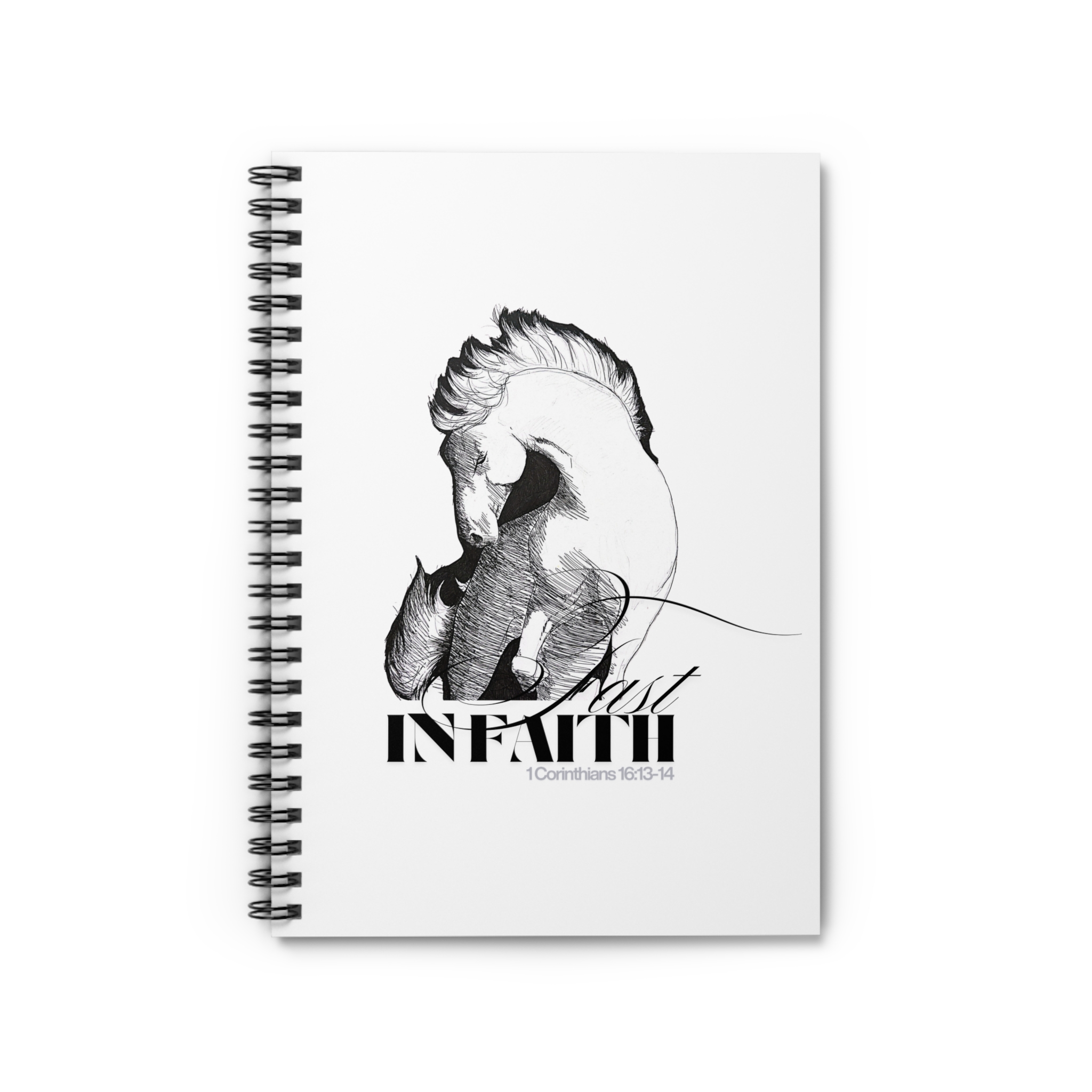 Introducing a beautifully designed Spiral Notebook featuring a striking front cover showcasing the distinctive horse illustration by Colorado artist Morghann Houghton brought together in an inspiring collaboration with the Word of God by Rebel-Faith graphic designer, Dawn Francis. Subtly lined pages await inspiration, sketches, lists and more. Metal spiral binding allows for smooth page turning and easy access to thoughts and ideas. The journal also comes with a useful document pocket on the inside back cover, ideal for storing notes or important papers. This notebook calls out to brave, vibrant and creative souls, making this journal a thoughtful gift for any occasion, and essential for each season of life.
